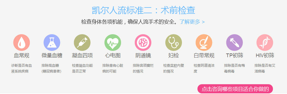 凯尔标准人流标准麻醉:专业麻醉技术,快速入睡,全程不知疼痛 可视标准:数字化可视系统辅助取孕囊,避免漏吸和吸宫不全 心电监护:手术全程监护患者的身体动态,避免手术意外 纳米吸管:纳米技术仿生吸管,变刮为吸,避免伤害 手术材料:严格采用一次性手术材料,避免交叉感染